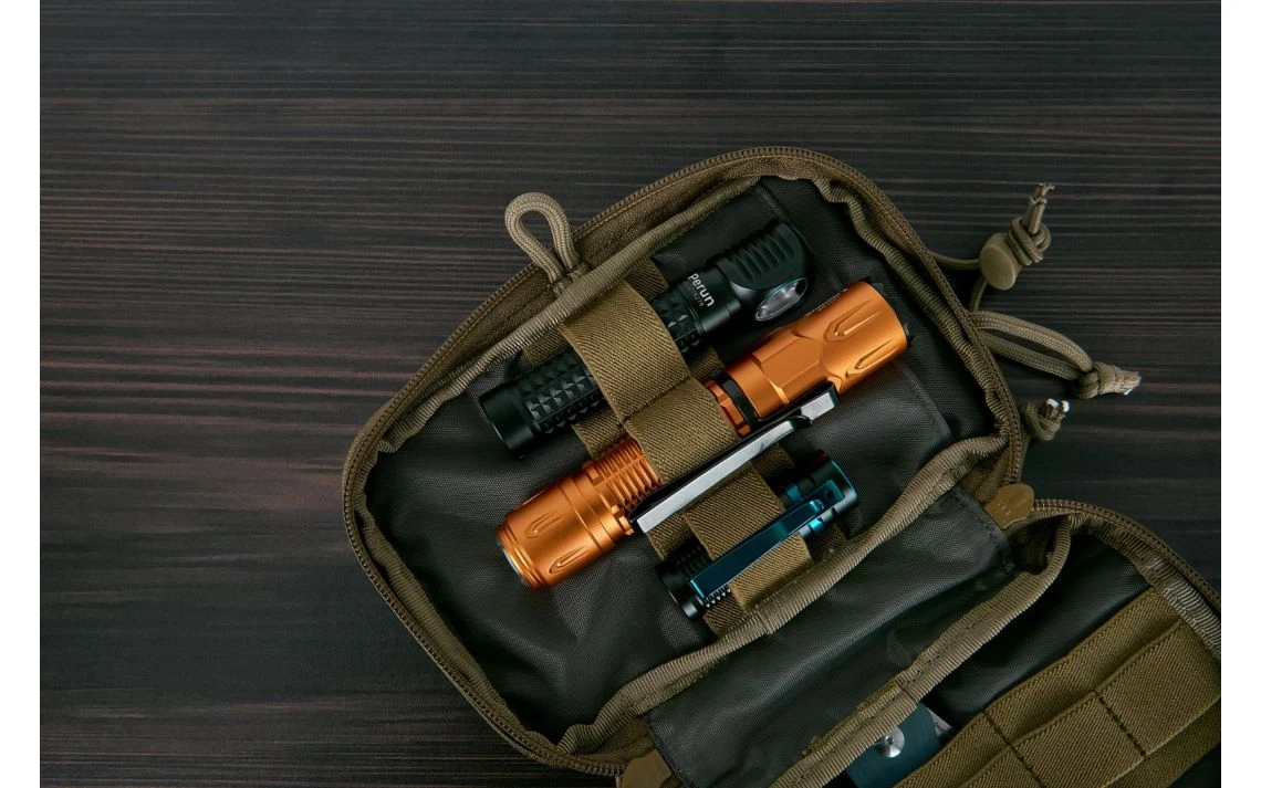 245g: Olight Obag EDCS is made of Nylon 500D Cordura as the main fabric and Nylon 1050D for the front panel, providing excellent splash and wear resistance. It has ample capacity with internal elastic bands and is easy to carry, designed with paracord loops, YKK zippers, and a Molle system.