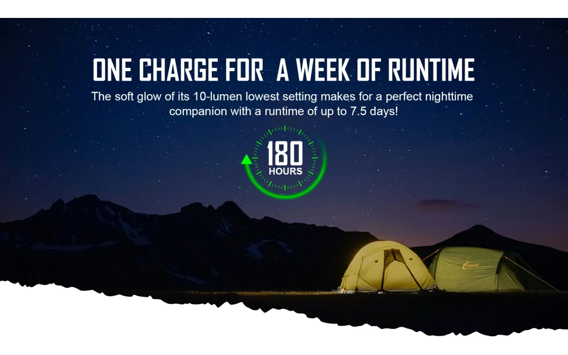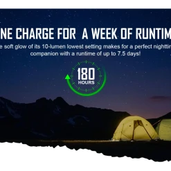 - Warm Orange LEDs (Mode 1): 10 lumens – 180 hours
