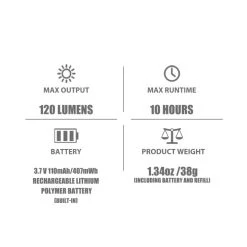 - 4 levels of brightness from 5 lumens to 120 lumens