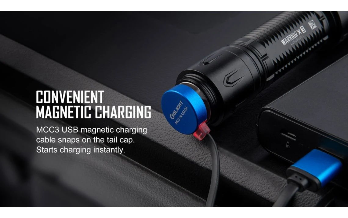 255g, 2,500 Lumens: The Olight Warrior X 3 is an upgraded version of the Warrior X Pro with a 19% higher output. The Warrior X 3 is a compact thrower with a max beam distance of 560m while still lighting up a wide area with a 2,500 lumen max output. The Warrior X 3 comes with both a warrior grip ring and silicone tactical grip ring to give you a secure hold. The Warrior X 3 also features a glass breaking strike bezel for use in emergency situations. Running off a customised 5000mAh 21700 Li-ion battery, the Warrior X 3 is rechargeable via the magnetic charging cable included. The Warrior X 3 has durable build quality and is impact resistant up to 2 metres as well as IPX8 waterproof rated. This torch is compatible with a range of mounts as well as the SRod remote switch, making it ideal for tactical and hunting uses. 5000mAh 21700 Li-ion rechargeable battery included.