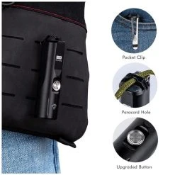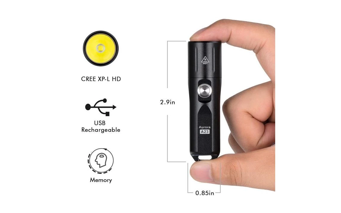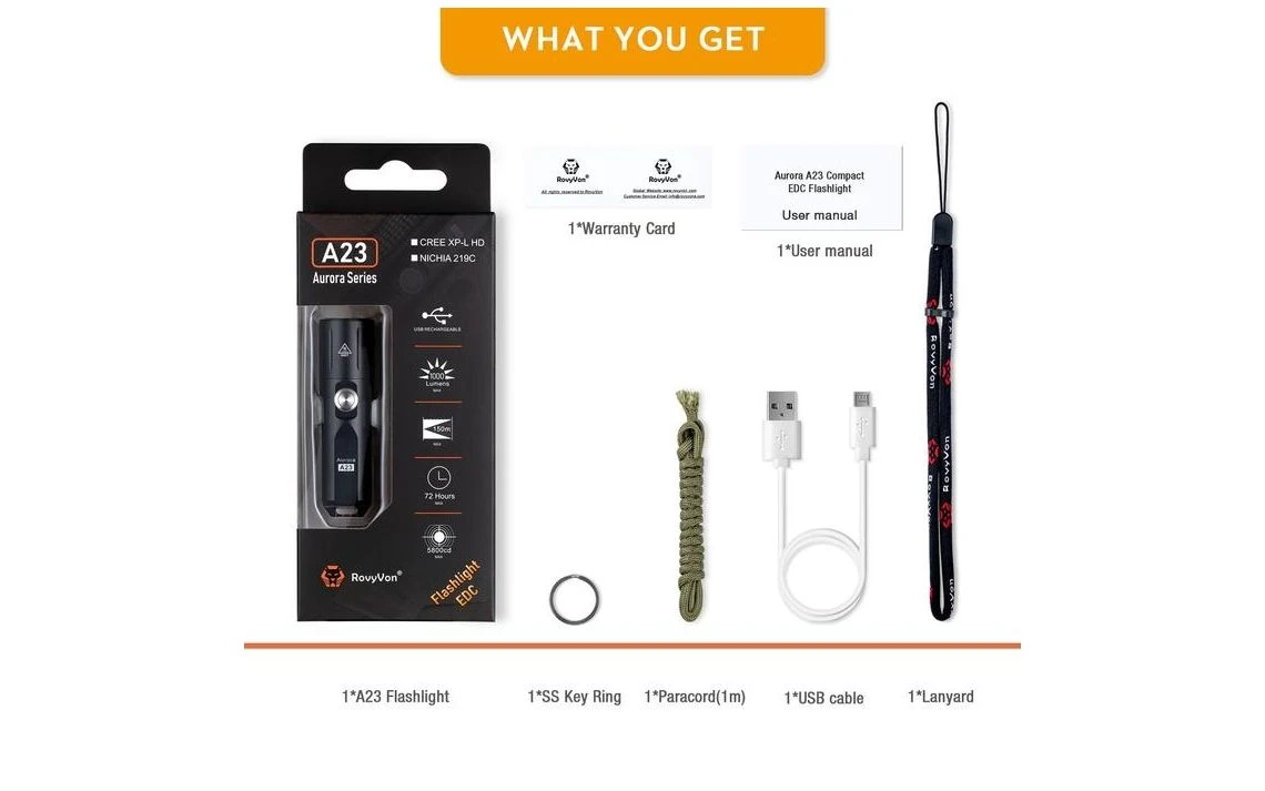 49.8g, 1,000 Lumens: The RovyVon Aurora A23 is a compact EDC torch with a very high output for its size. The A23 is CNC precision-crafted from 6063 aluminium alloy and has a black finish. It is available with a CREE LED that has a max output of 1,000 lumens or a Nichia LED that has a max output of 700 lumens. The CREE LED is the brightest while the Nichia LED is a warm light and renders colours as accurate as possible. The A23 has 4 levels of brightness plus a strobe and SOS mode which can all be easily controlled using the single side switch. The A23 runs off a 600mAh lithium polymer battery and is rechargeable in one hour with the included Micro USB cable. The A23 has a pocket clip as well as a hole to attach the included lanyard, keyring or paracord, giving you many options for carrying this torch. It also has two tritium slots if you want to make this torch stand out even more (vials not included). The high output, versatility and compact size makes this an excellent EDC torch. Compact EDC torch with high output.