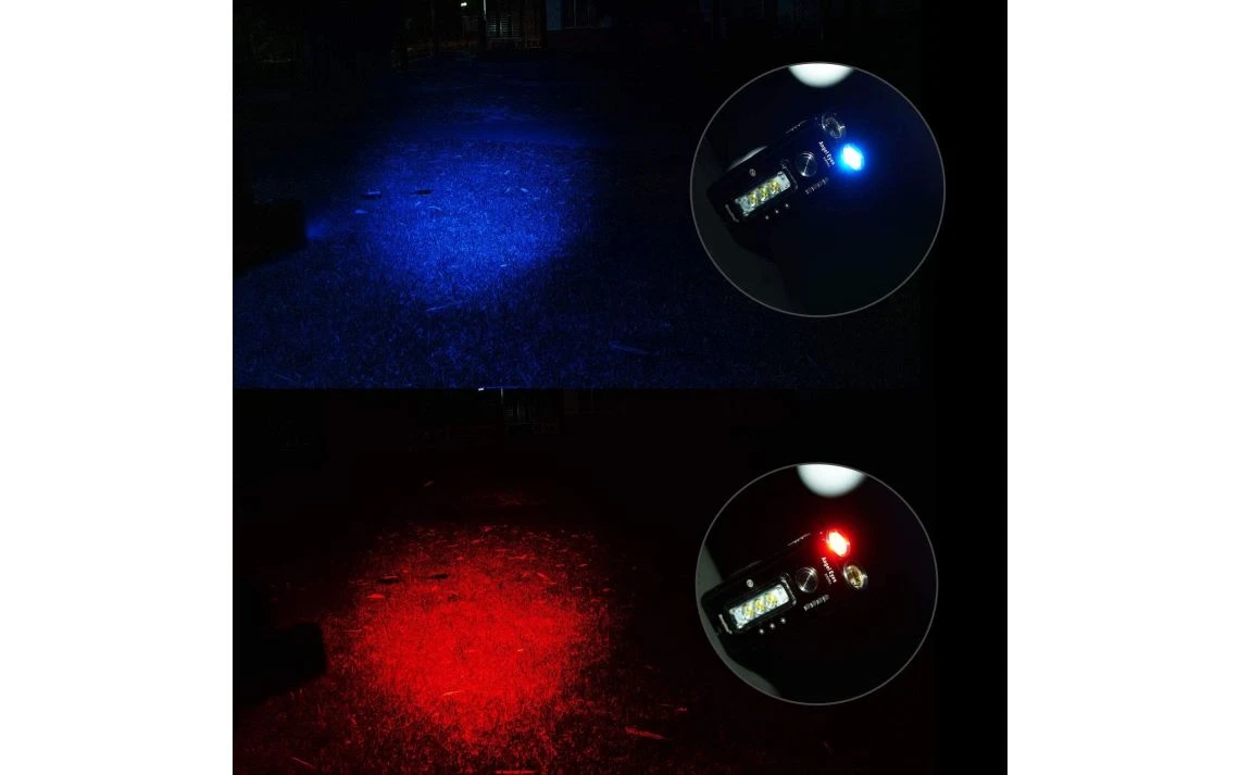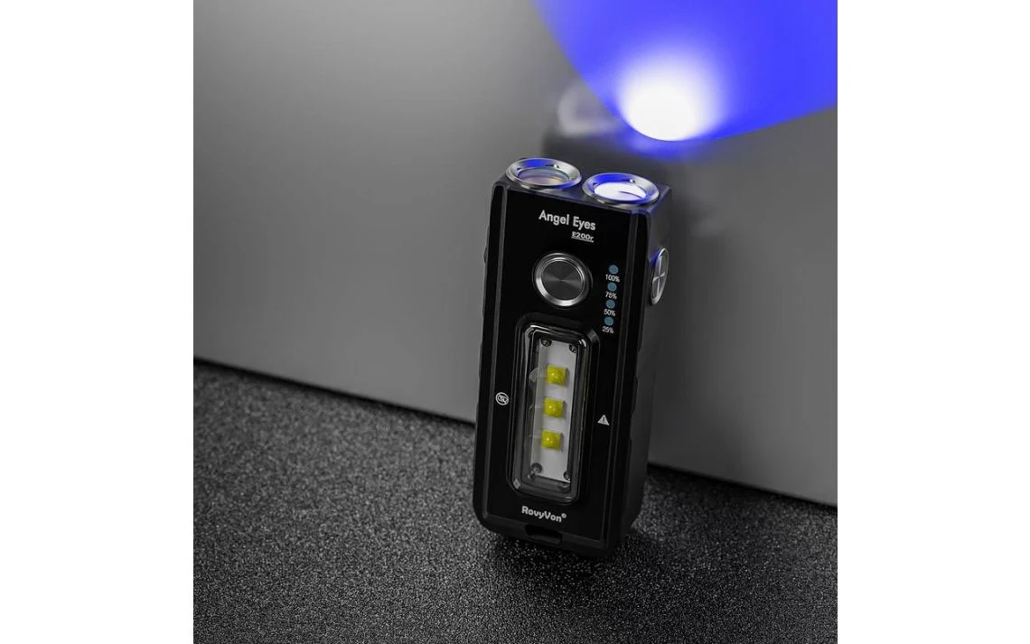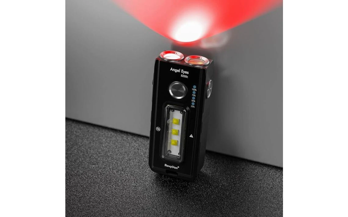 82g, 1000 Lumens: The RovyVon Angel Eyes E200r is a compact multifunctional torch for everyday carry that offers you red, blue and white light. It features one red and one blue LED at the front as well as three neutral white LEDs on the side that produce up to 1000 lumens. The E200r runs off a built-in 1400mAh Li-ion battery and is directly rechargeable with the included USB-C cable and charges in only 48 minutes. The E200r features two metal e-switches for easy operation as well as a battery level indicator. The E200r also features a pocket clip for mounting on your hat or gear and a built-in tripod port allows you to mount it onto a tripod for photography and other purposes. Produces red, blue and white light.