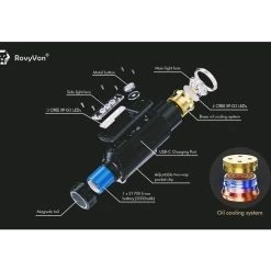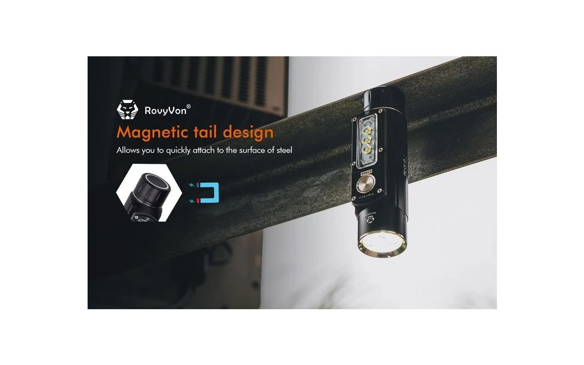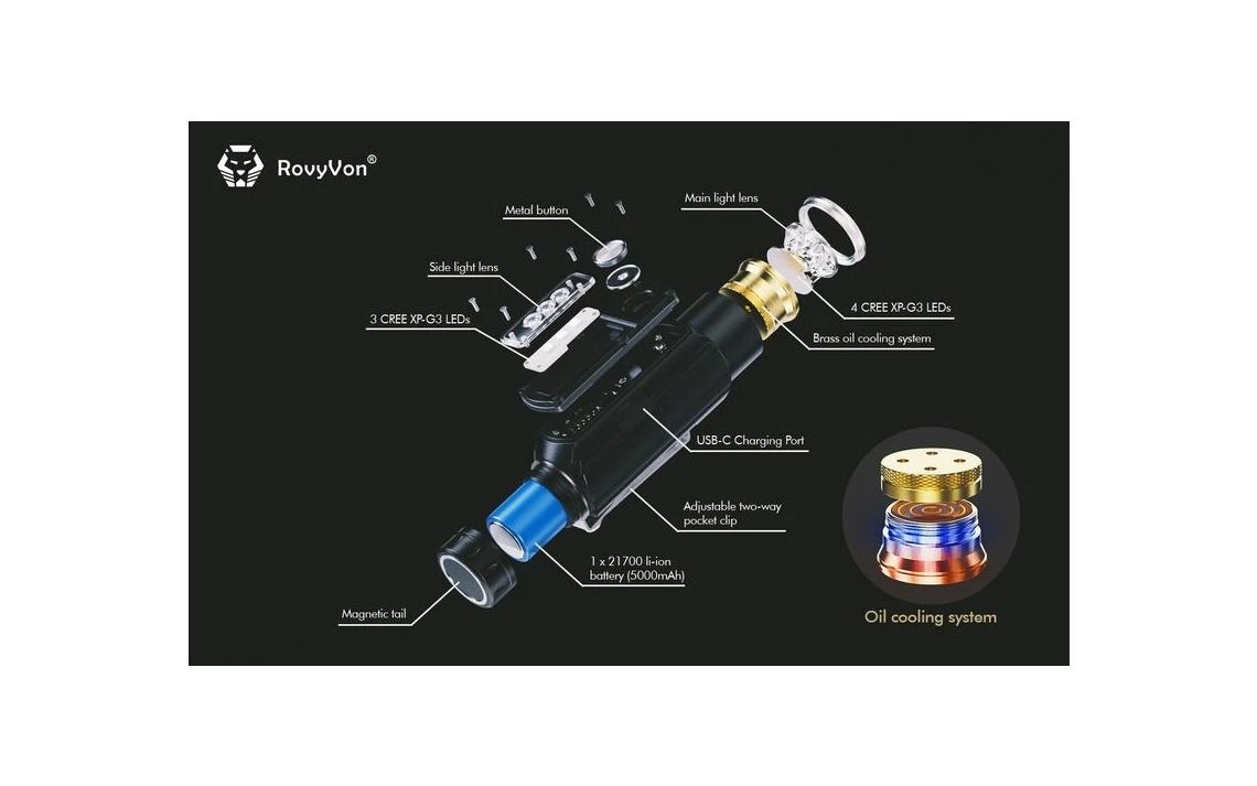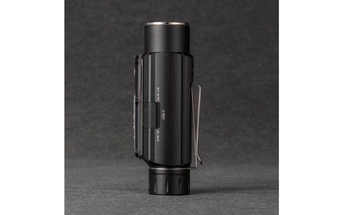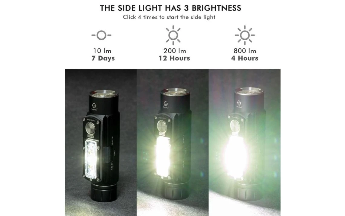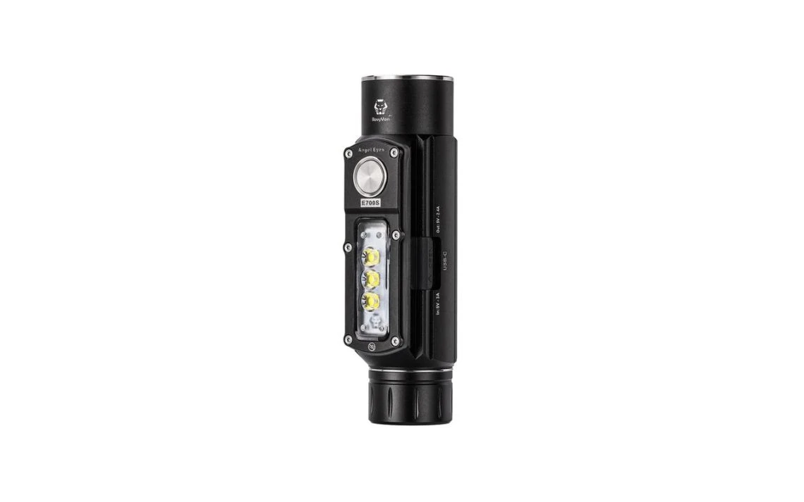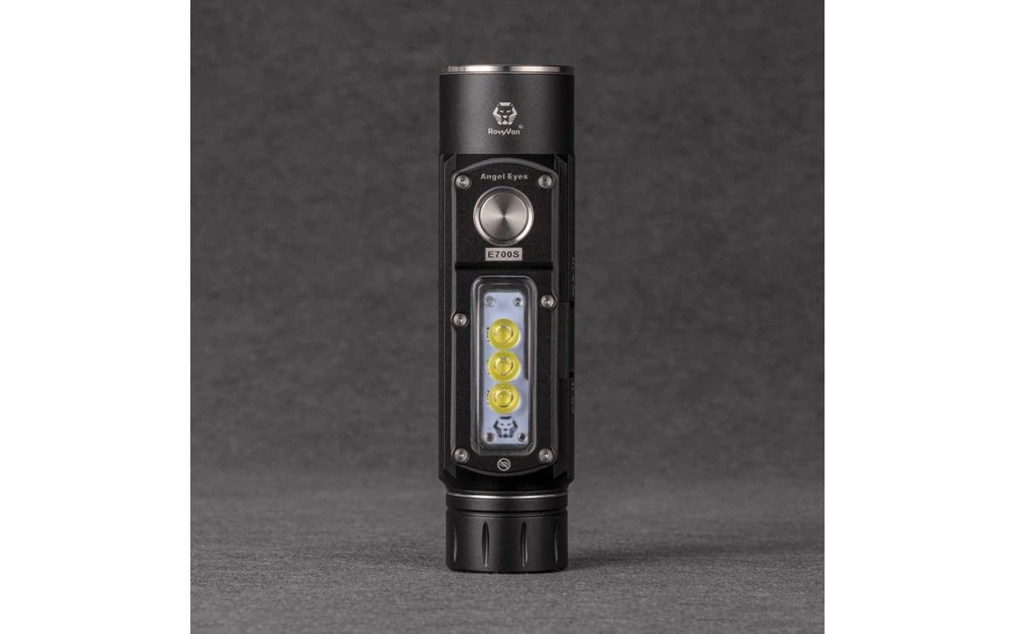 230g, 2800 Lumens: The RovyVon Angel Eyes E700S is a multi-purpose light with 7 CREE XP-G3 LEDs, 4 in the main light and 3 on the side. The main light has a max output of 2800 lumens, while the side light has a max output of 800 lumens. For the standard output there are 4 brightness levels to choose from, ranging from 200 to 2800 lumens and for the side light there are 3 brightness levels, ranging from 10 to 800 lumens. You can operate this torch with one hand, attach it with the two-way pocket clip, mount it on magnetic surfaces or mount it on a tripod with the built-in tripod hole. The torch runs off a powerful 5000mAh 21700 Li-ion battery (included) and the torch is directly rechargeable via the included USB-C charging cable and features a dynamic charging indicator. The E700S can also function as a power bank to recharge other USB-C devices. With 2 different lights and multiple mounting options this is a great tool with an infinite number of applications. Features both a main light and side light.