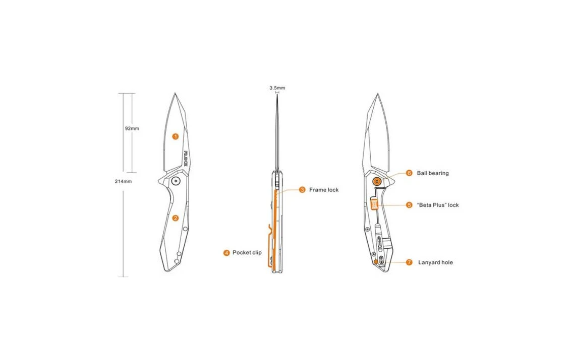 P135-SF is outstanding in its blade with a thickness of 3.5mm and it is made of 14C28N stainless steel, which features razor sharpness and a finely tapered tip, making the knife more powerful in cutting, chipping and piercing. The handle is made of 420 stainless steel, and it is stonewashed to allow fine and comfortable sense of touch. In addition, thanks to the flipper and ball bearing pivot design, the knife can be deployed smoothly and effortlessly. An unique “Beta Plus” safety lock is fitted to strengthen the locking mechanism extremely reliable even though the sturdy liner lock is made of stainless steel.