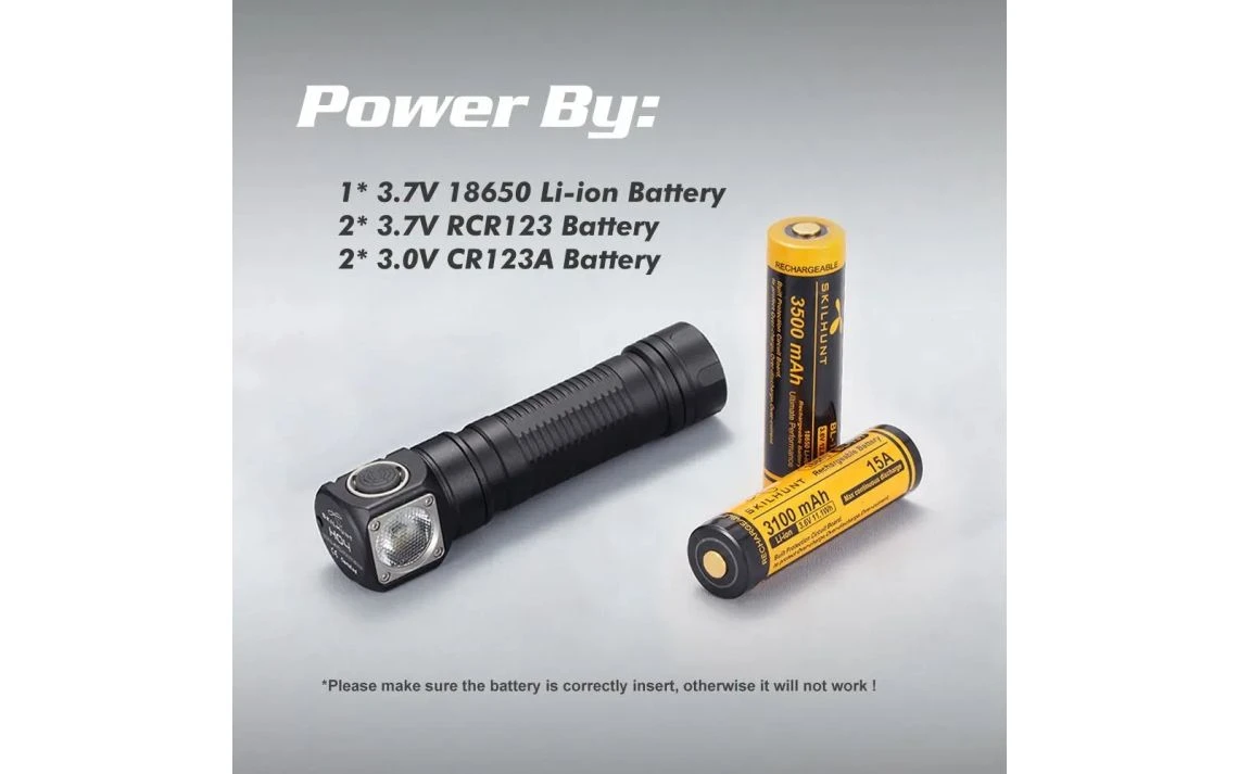 - Runs On: 1 x 3500mAh 18650 Li-ion battery (included) or 2 x 1700mAh CR123A batteries