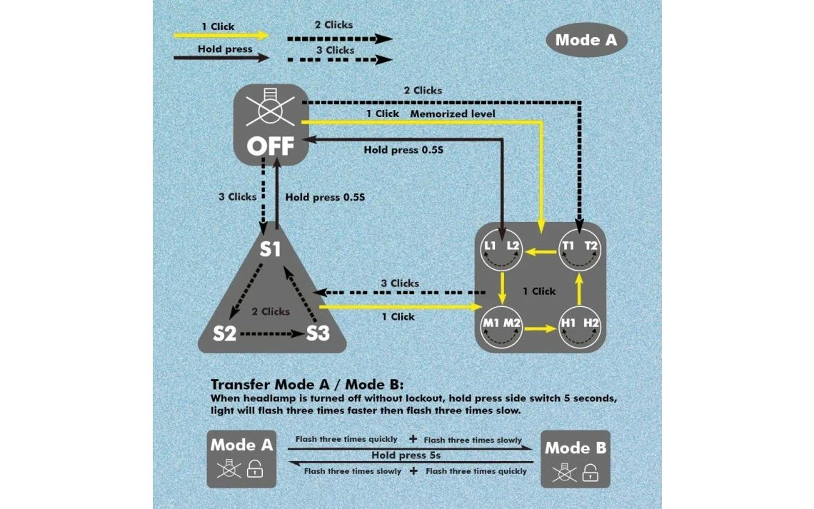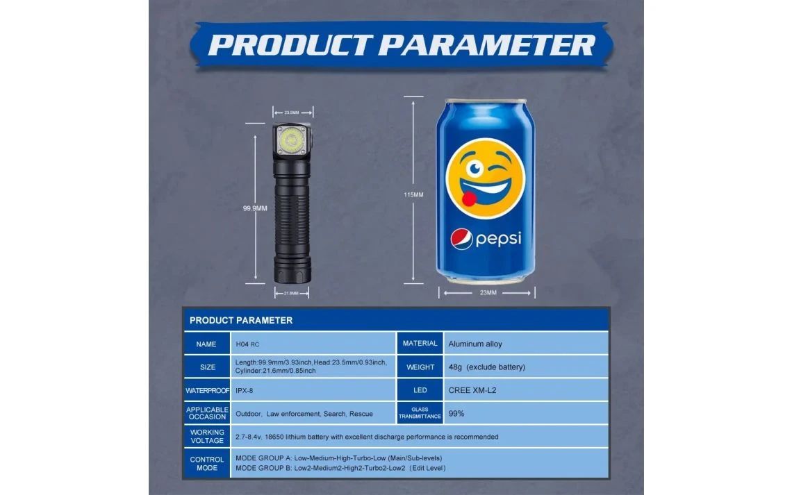 46g, 1,000 Lumens: The Skilhunt H04 RC is a compact multipurpose headlamp and right angle light. The H04 RC is the rechargeable version of the Skilhunt H04. It produces a max output of 1,000 lumens and has a max beam distance of 123m from a CREE XM-L2 LED. The H04 has two user interface modes which allow you to use it normally or customise brightness levels. On each mode you have 4 brightness levels as well as strobe modes. The H04 runs off a 18650 Li-ion battery (included) or 2 x RC123/CR123A batteries. To charge the H04 RC you can conveniently charge it via the included USB magnetic charging cable. Other features of this light include the removable pocket clip, battery level indicator, magnetic tail cap, lockout function, memory function and IPX-8 waterproof rating. Two user-interface groups to choose from.