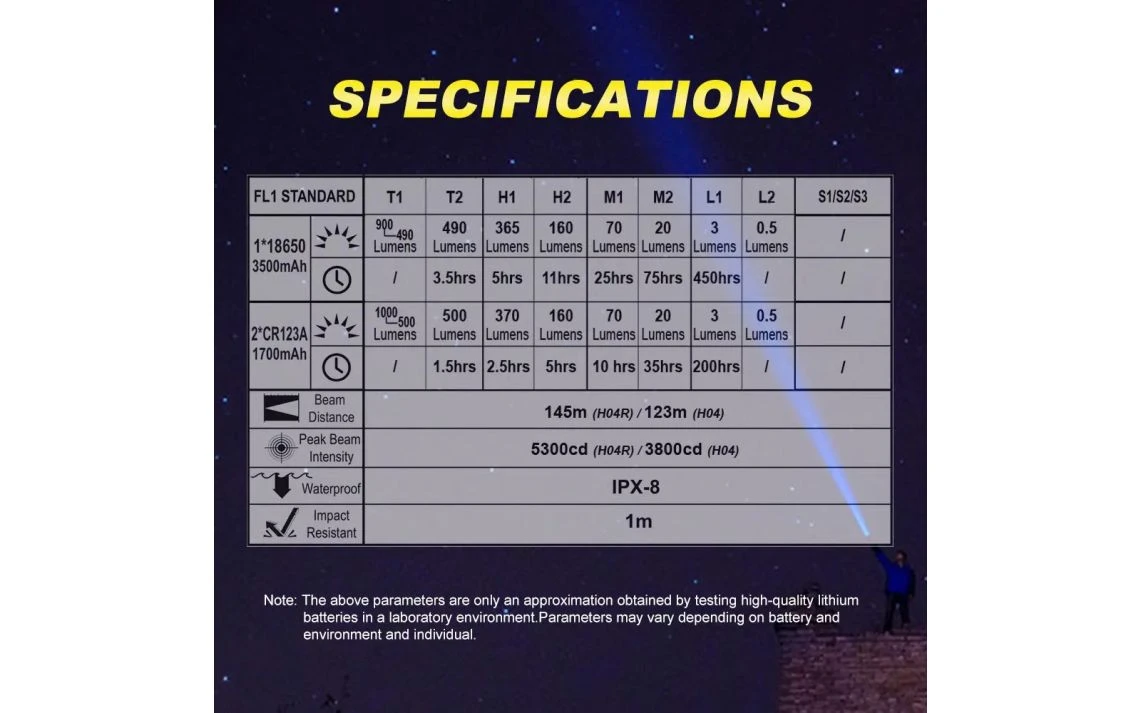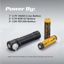 - Runs On: 1 x 3500mAh 18650 Li-ion battery (included) or 2 x 1700mAh CR123A batteries