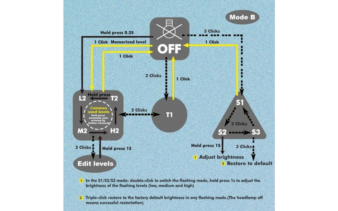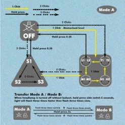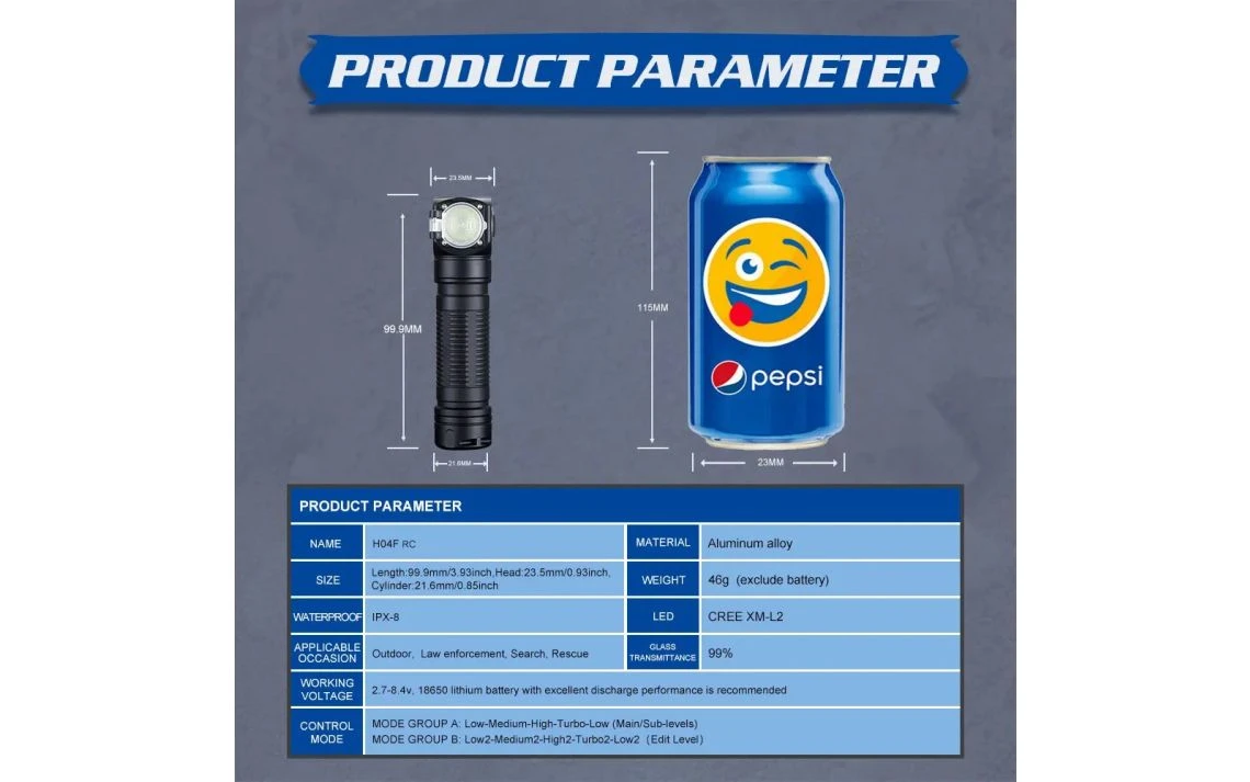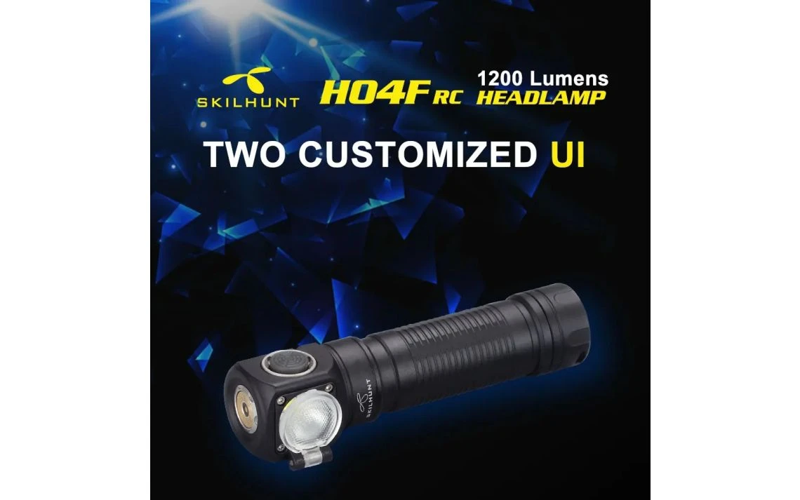 96g, 1,000 Lumens: The Skilhunt H04F RC is a compact multipurpose headlamp and right angle light. It produces a max output of 1,000 lumens and has a max beam distance of 123m from a CREE XM-L2 LED. The H04F RC has an adjustable lens that can change the beam from focused to flood for meeting different demands. The H04F RC has two user interface modes which allow you to use it normally or customise brightness levels. On each mode you have 4 brightness levels as well as strobe modes. The H04F RC runs off a 18650 Li-ion battery (included) or 2 x RC123/CR123A batteries. To charge the H04 RC you can conveniently charge it via the included USB magnetic charging cable. Other features of this light include the removable pocket clip, battery level indicator, magnetic tail cap, lockout function, memory function and IPX-8 waterproof rating. Two user-interface groups to choose from.
