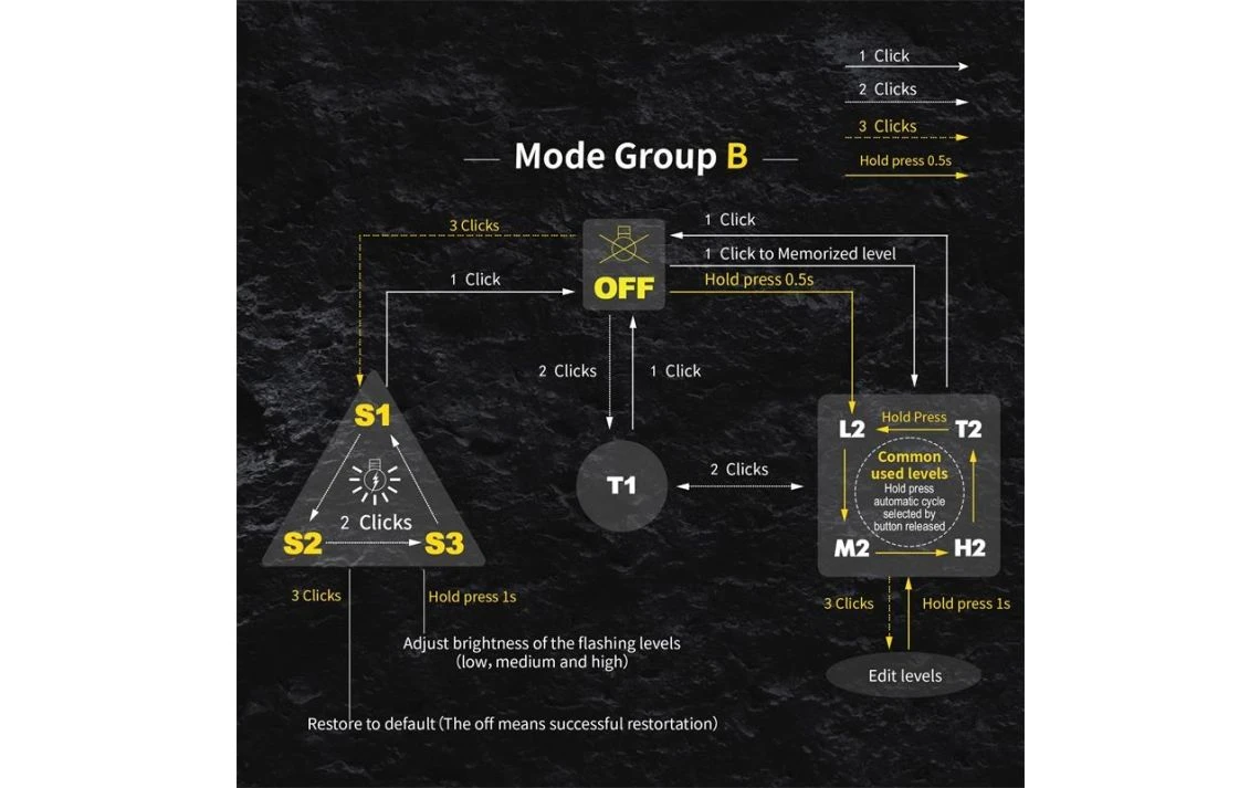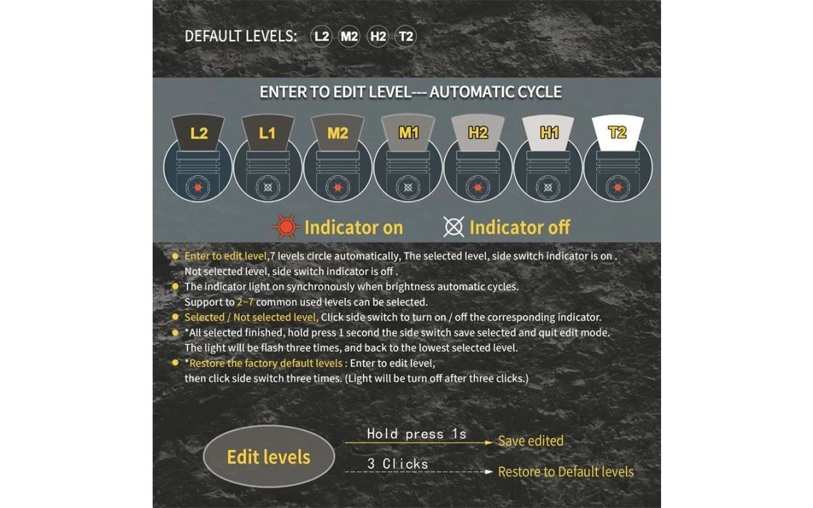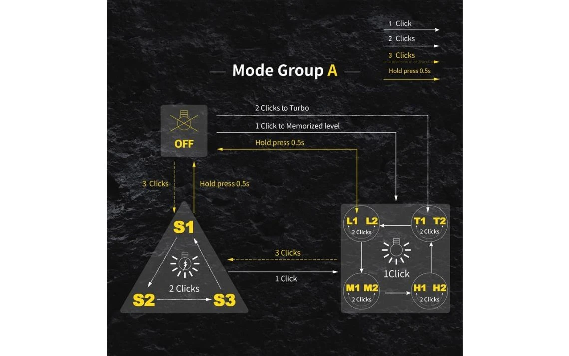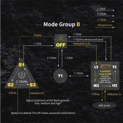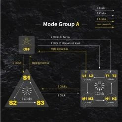 - T2: 480 – 340 – 200 Lumens – 3 + 30 + 60 Mins