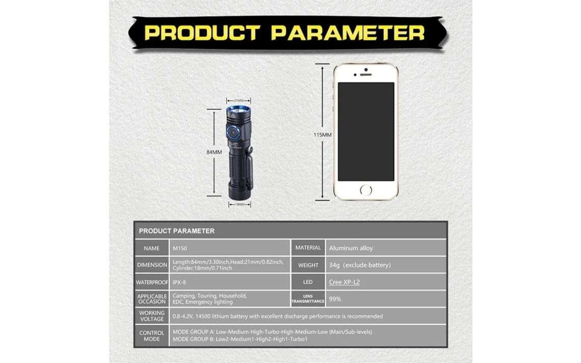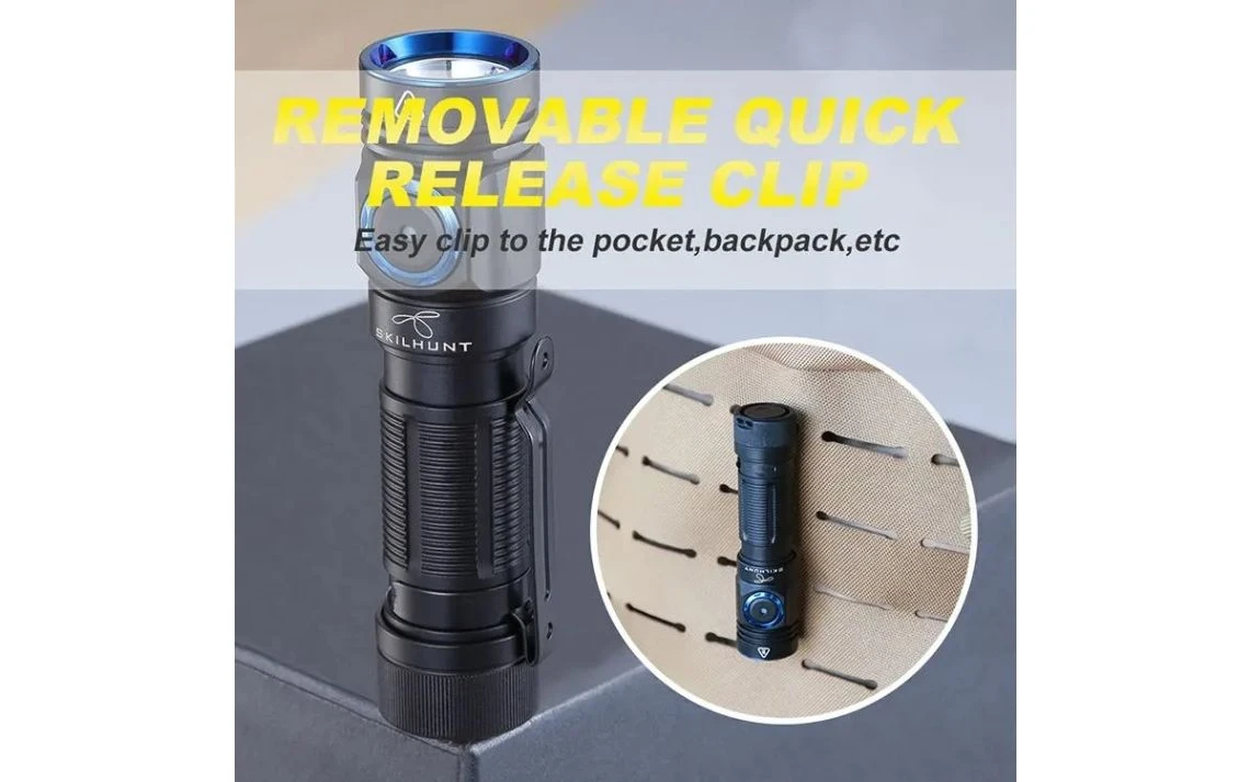 34g, 750 Lumens: The Skilhunt M150 is a lightweight everyday carry torch that has a max output of 750 lumens and a 110m beam distance. The M150 features two user interfaces which allow you to customise the output and have access to a variety of brightness levels. The M150 runs off a 1050mAh 14500 Li-ion battery (included) or is compatible with all AA batteries. This torch also features convenient magnetic charging via the included USB magnetic charging cable. Other features of this torch include the single side switch, removable pocket clip, power indicator, magnetic tail and IPX-8 waterproof rating. This is an ideal torch for EDC, camping and other outdoor adventures. 1050mAh 14500 Li-ion battery included.
