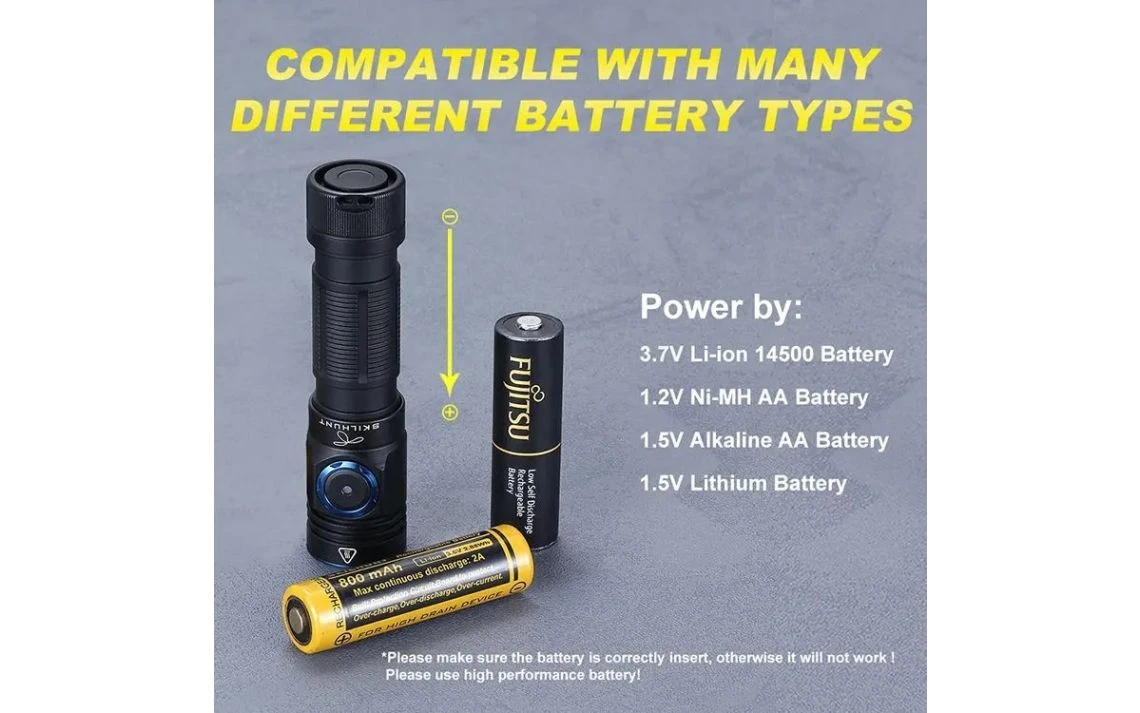 - Compatible with 14500 Li-ion batteries and all AA batteries