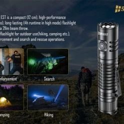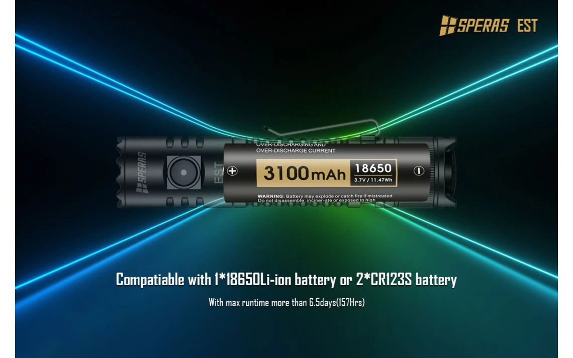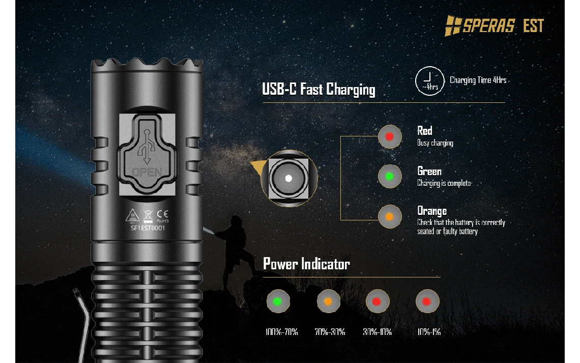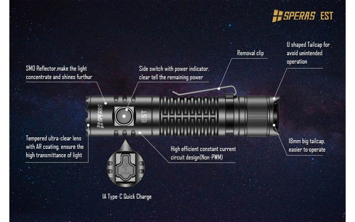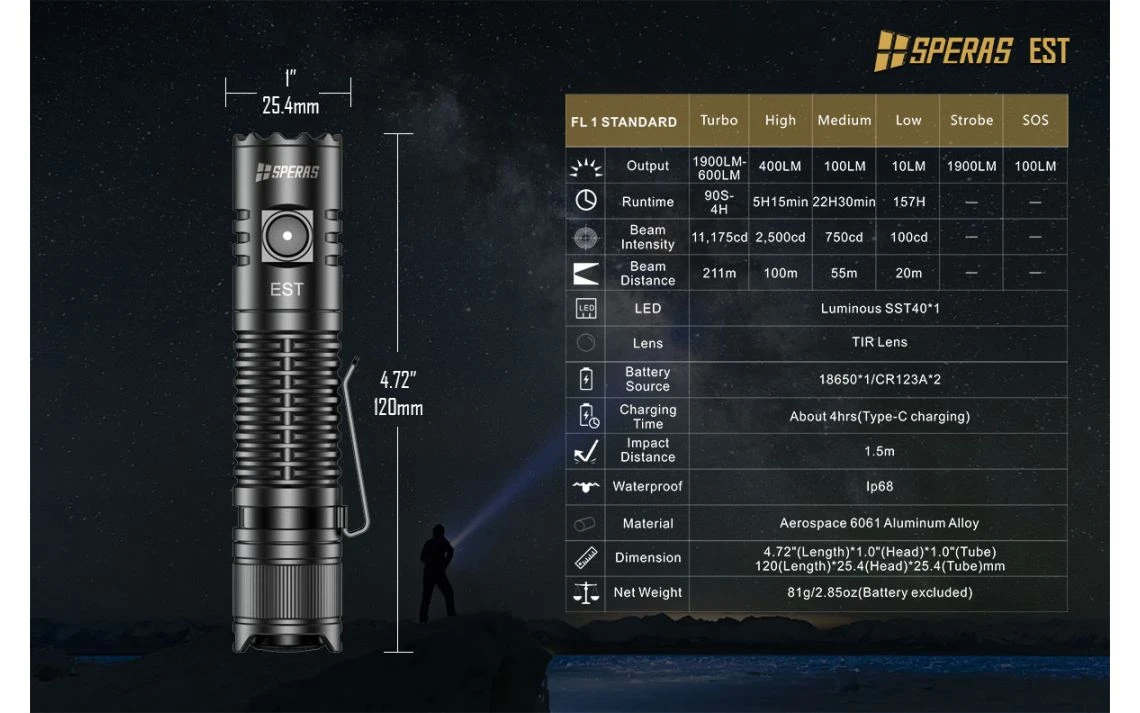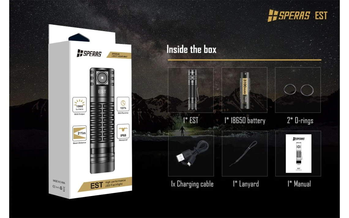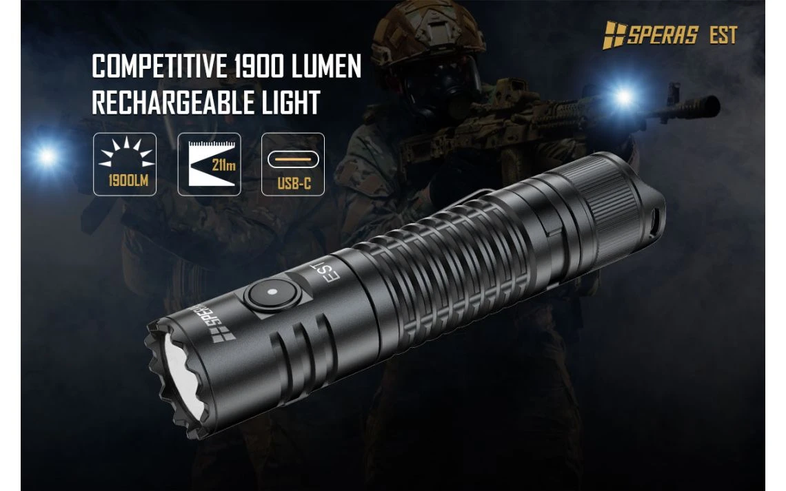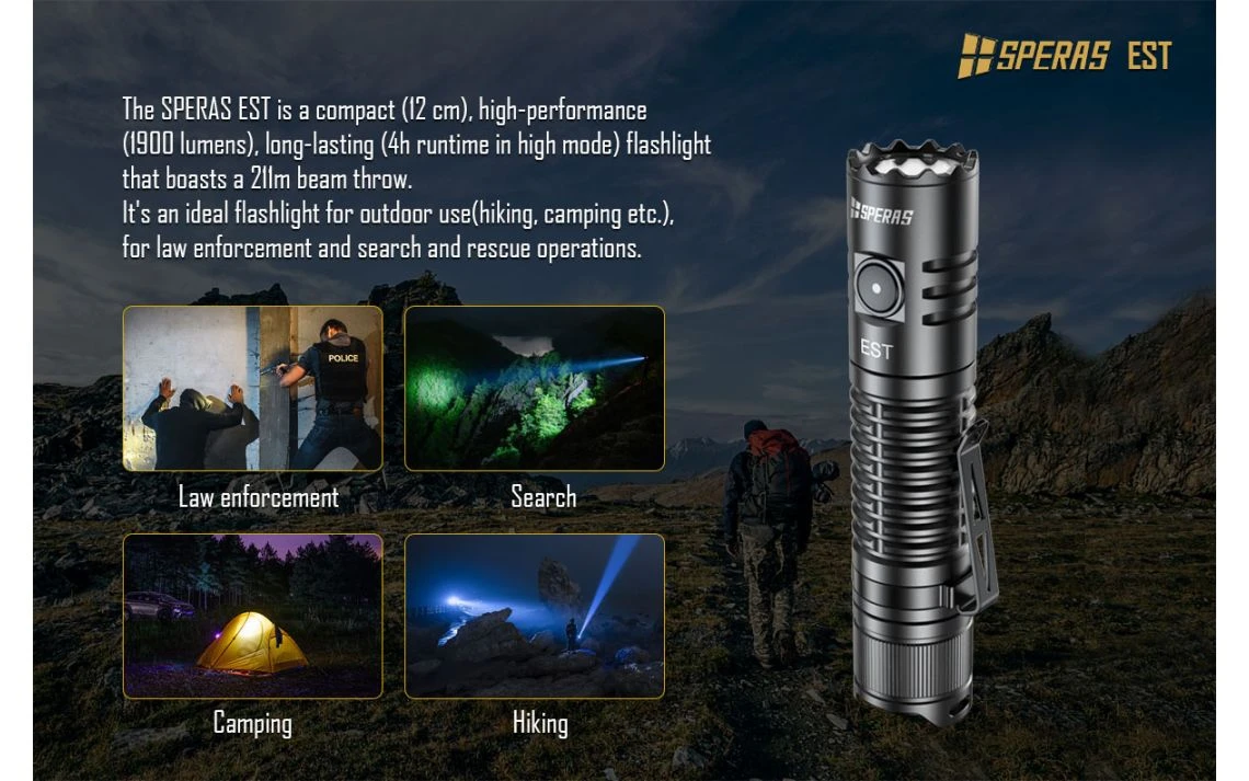 81g, 1900 Lumens: The SPERAS EST is a compact (12 cm), high-performance (1900 lumens), long-lasting (4-hour runtime in high mode) flashlight that boasts a 211m beam throw. Multiple battery sources can be used to power the EST. This ensures options to keep you powered up. The USB-C charging reduces charge time and ensures you can charge wherever a power source is available. These features make the EST an ideal flashlight for outdoor use (hiking, camping, etc.), for law enforcement, and for search and rescue operations. 1900 lumens and Type C.