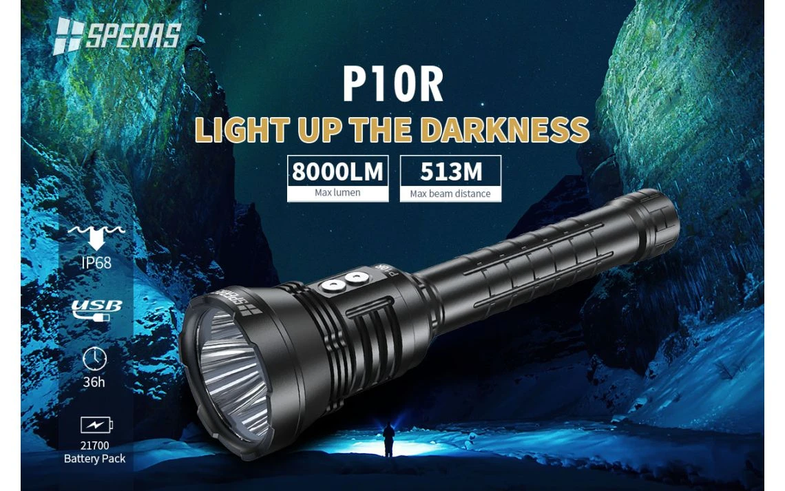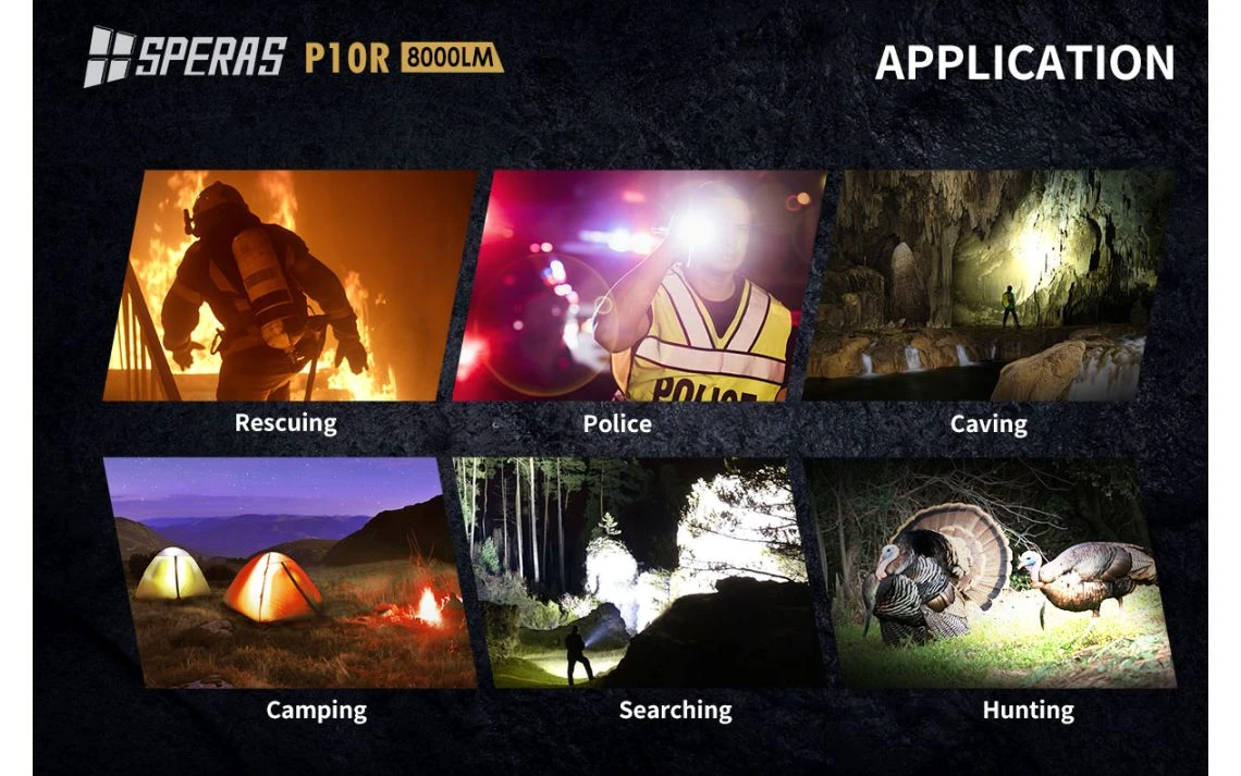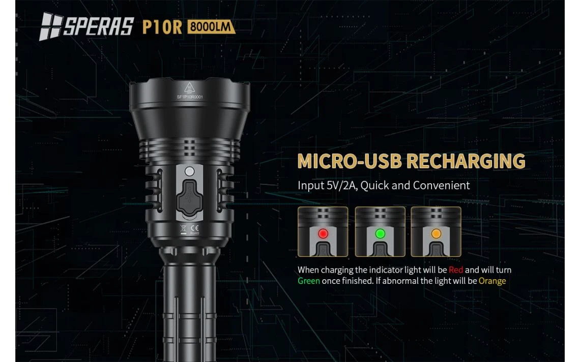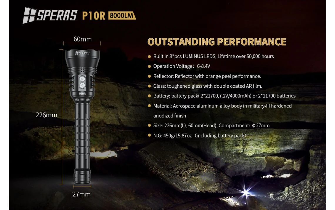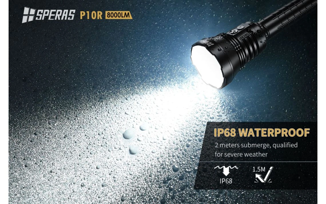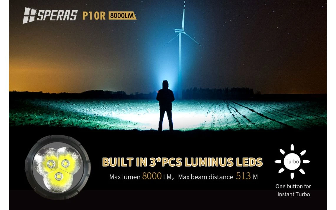 450g, 8000 Lumens, 65,760cd: The Speras P10R is a ultra-high performance handheld rechargeable Search & Rescue LED Torch. Max 8000 lumens and 513m beam throw, powered by the included battery pack and three LUMINUS LEDs. USB rechargeable ay 5V 2A. Power indication and mode memory function.