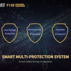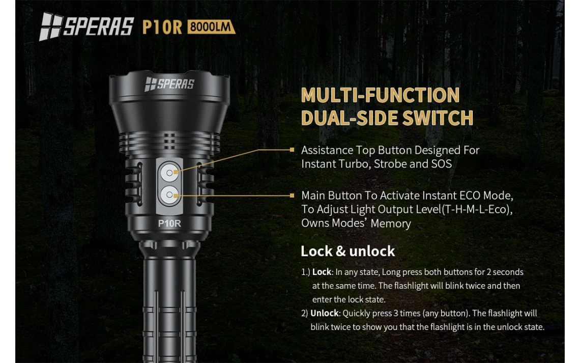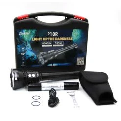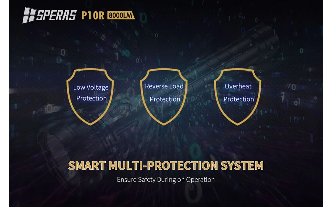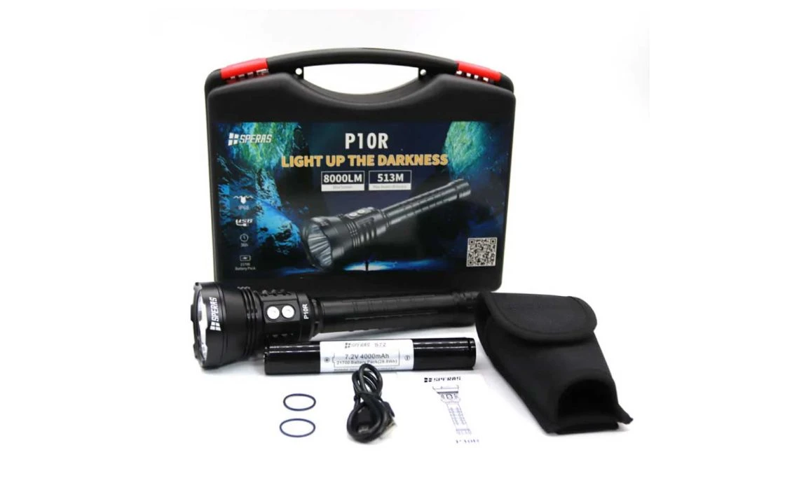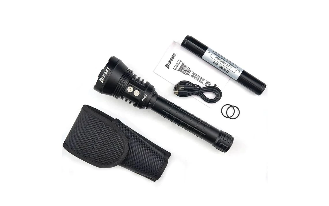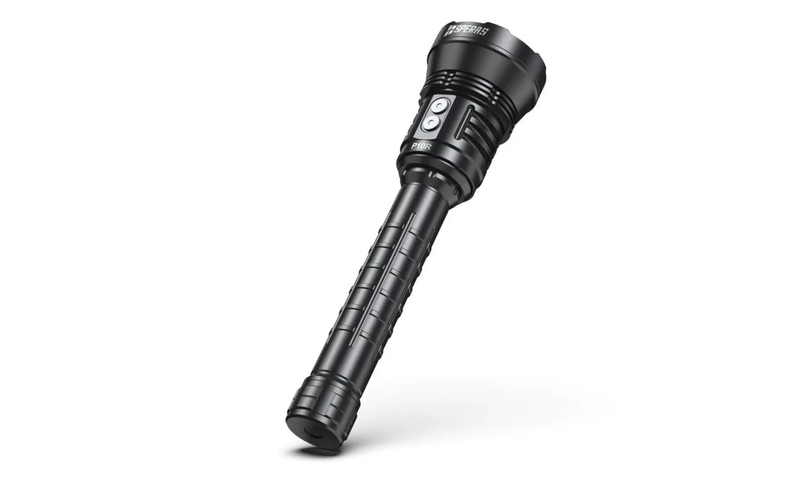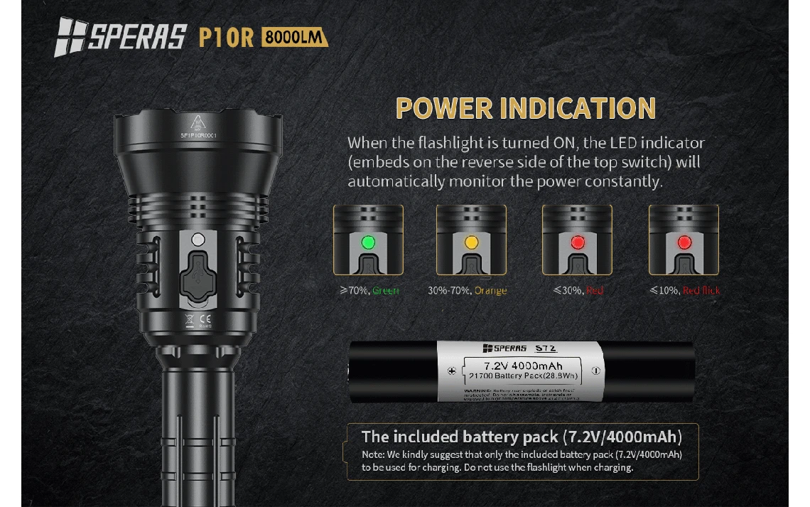 450g, 8000 Lumens, 65,760cd: The Speras P10R is a ultra-high performance handheld rechargeable Search & Rescue LED Torch. Max 8000 lumens and 513m beam throw, powered by the included battery pack and three LUMINUS LEDs. USB rechargeable ay 5V 2A. Power indication and mode memory function.
