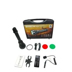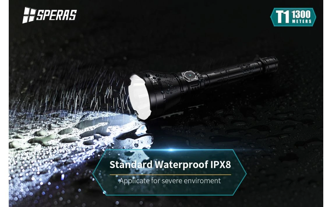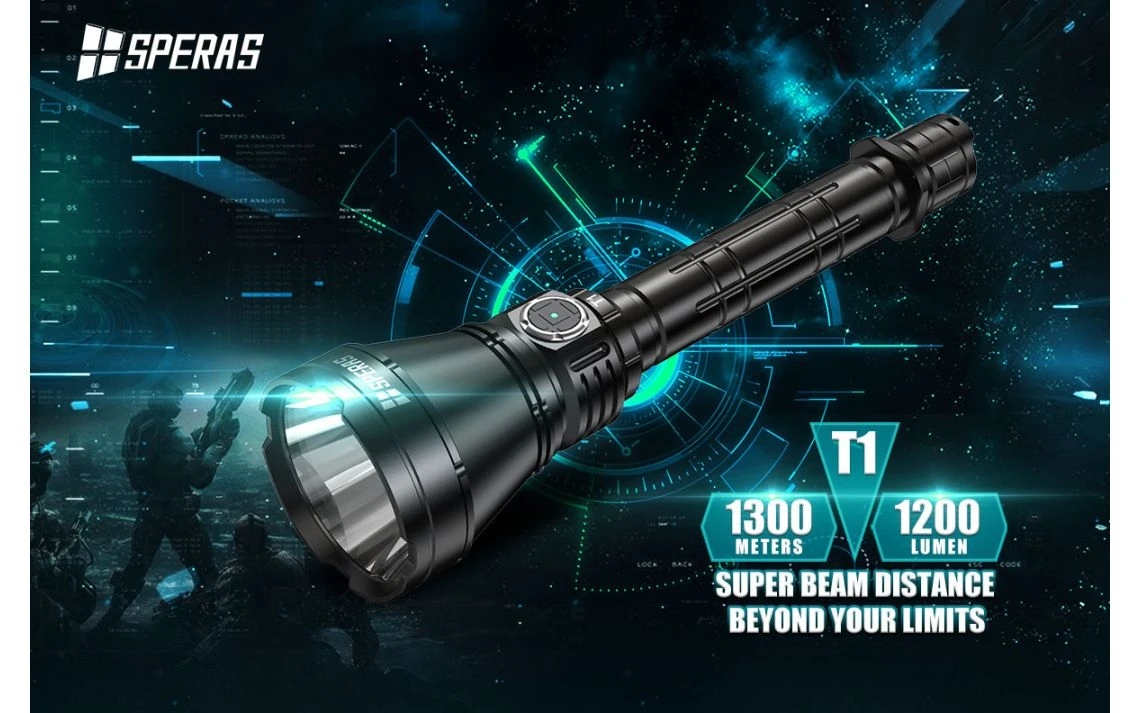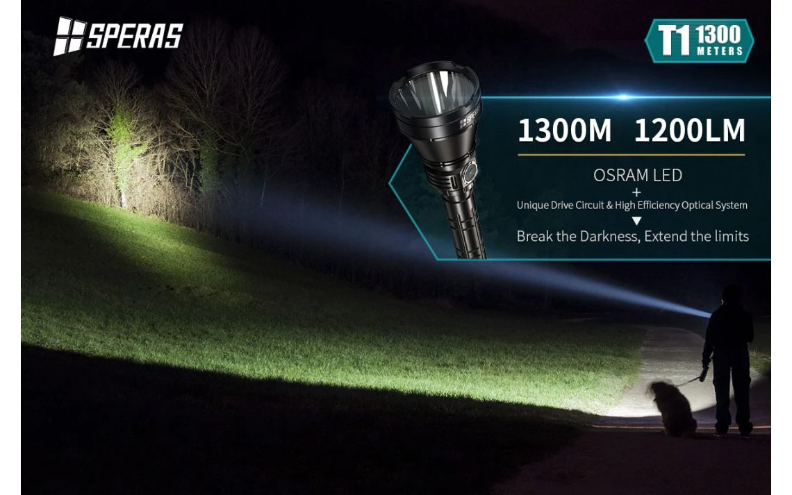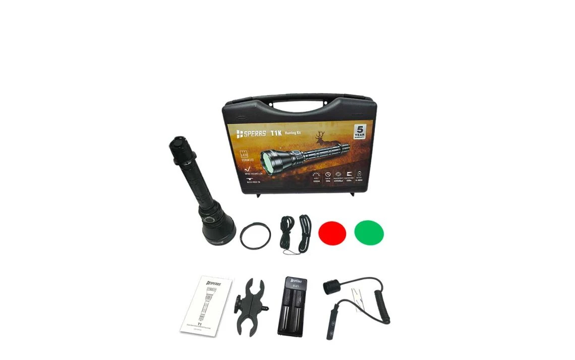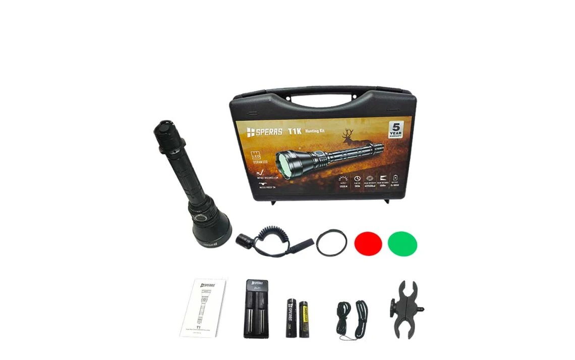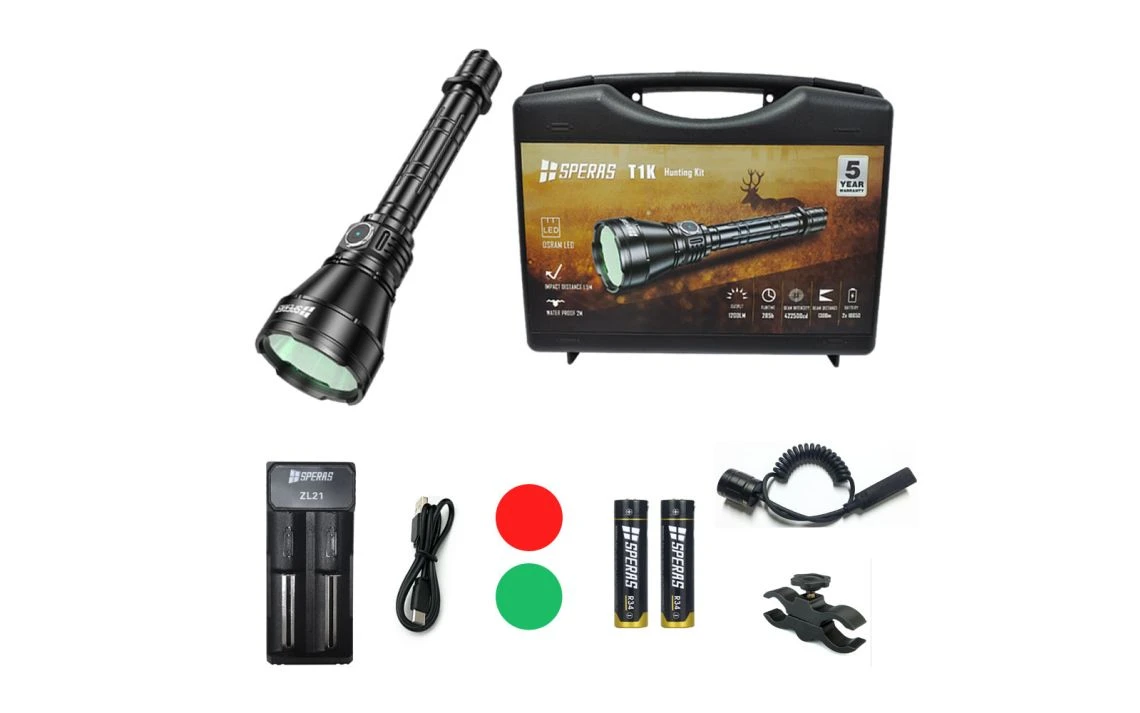 263g, 1200 Lumens, 422,500cd: The SPERAS T1 has a beam distance of 1300m and high output of 1200lm, a customized OSRAM LED, a synchronous step-down circuit with high efficiency up to 92% and special optical system. Complete Hunting kit in a hard case at a super affordable price.
