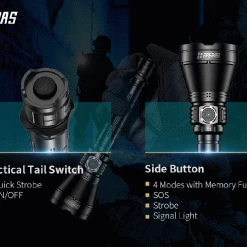 - Multifunctional tail button with mode memory function is designed for ON, momentary-ON, and quick strobe.