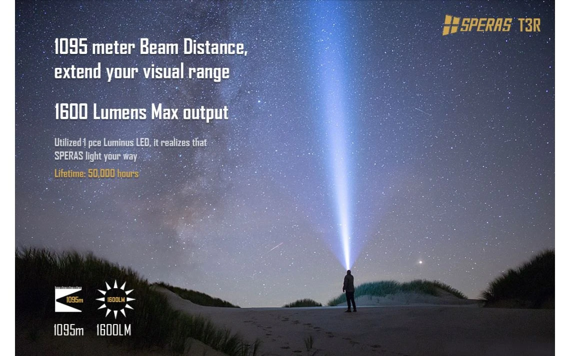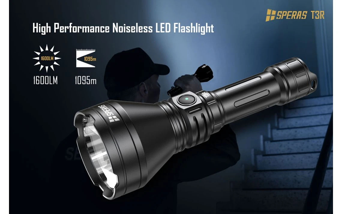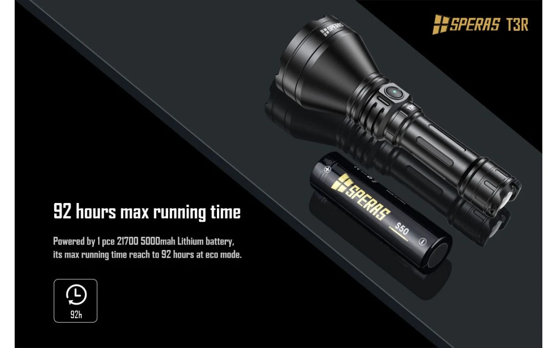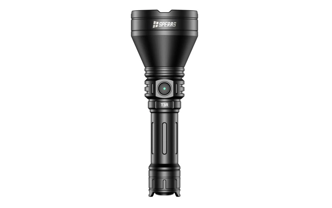 308g, 1600 Lumens, 300,000cd: SPERAS T3R is an innovative “thrower”. Despite its compact size it can reach a maximum throw of 1095 meters with its output of 1,600 lumens. This together with a maximum run time of 92 hours makes it an excellent high performance torch for hunting, outdoor, search and rescue, etc. 21700 powered Type C hunting torch.