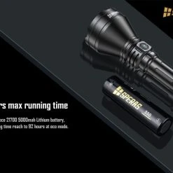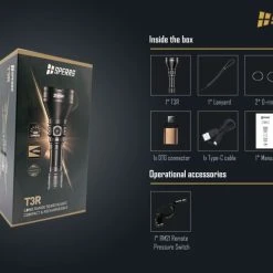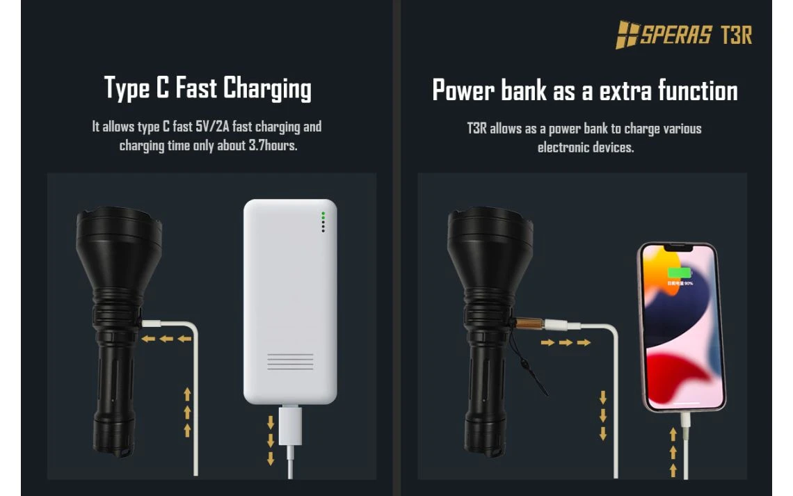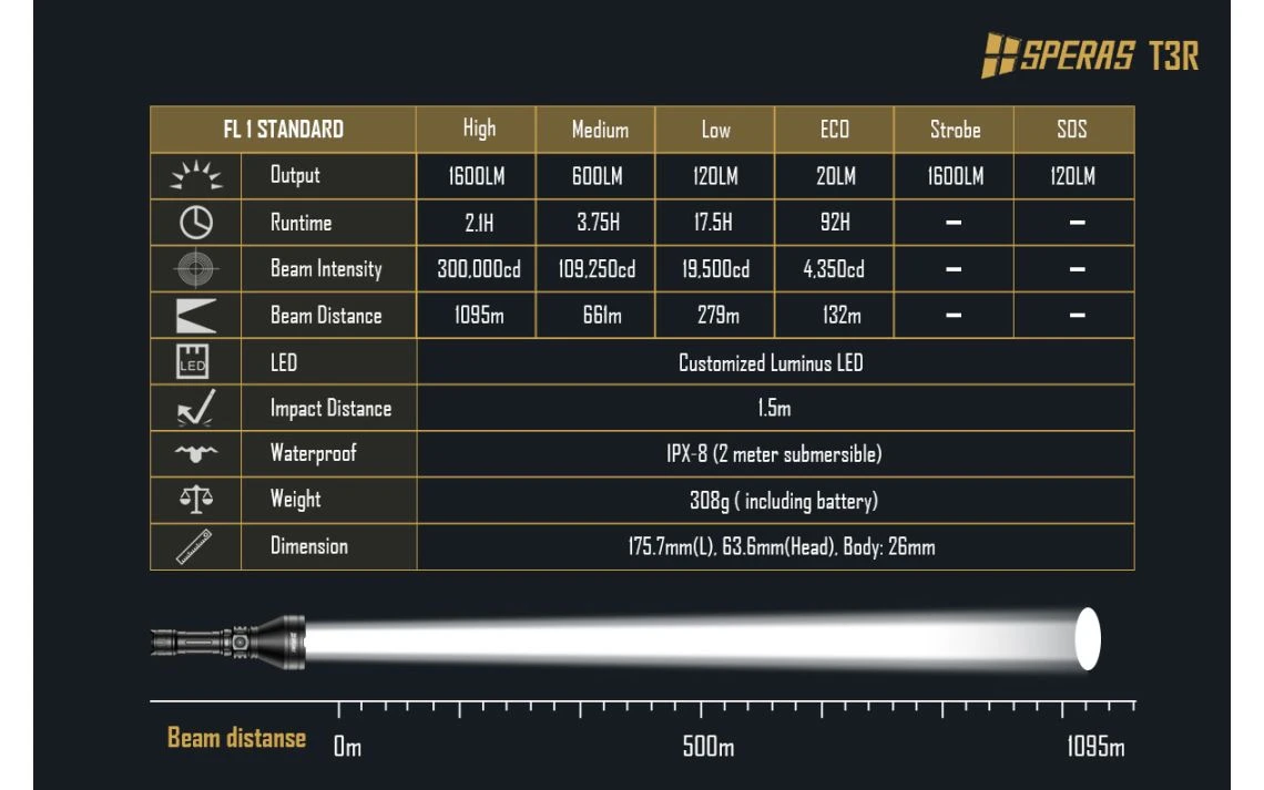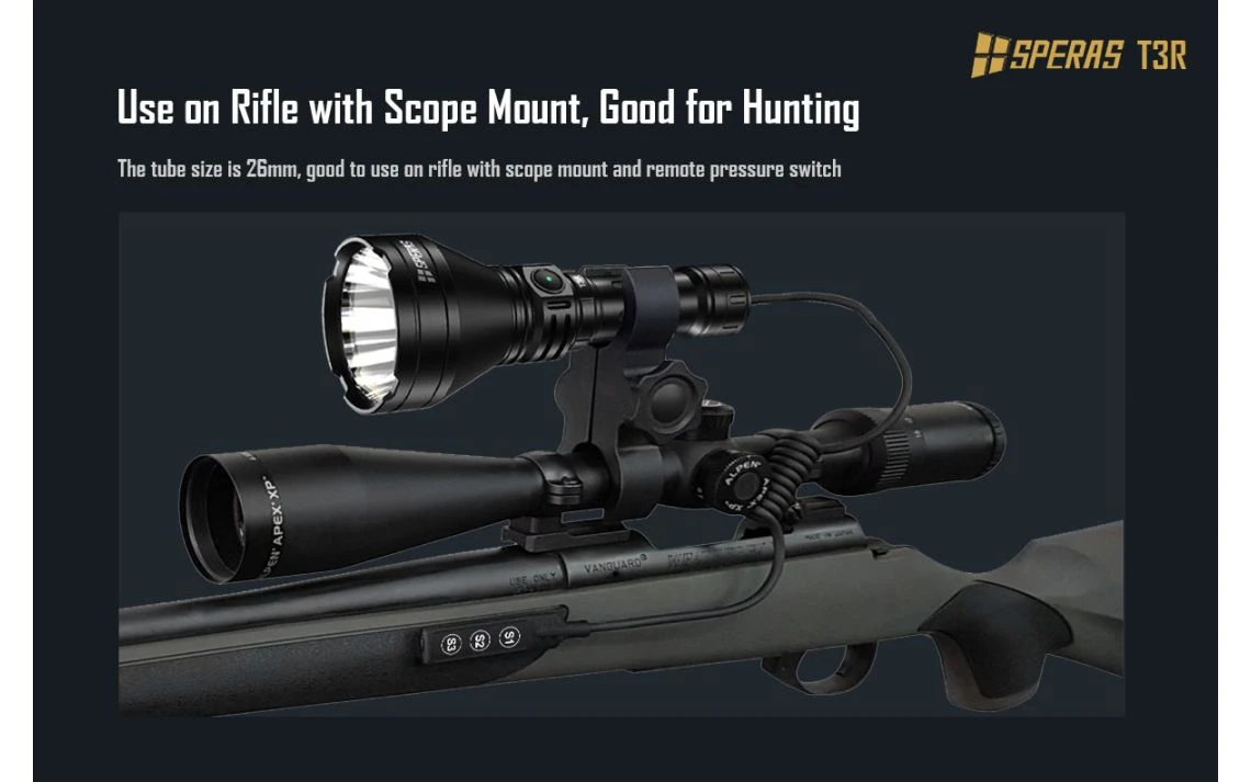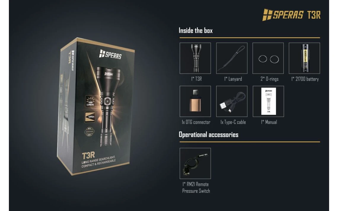 308g, 1600 Lumens, 300,000cd: SPERAS T3R is an innovative “thrower”. Despite its compact size it can reach a maximum throw of 1095 meters with its output of 1,600 lumens. This together with a maximum run time of 92 hours makes it an excellent high performance torch for hunting, outdoor, search and rescue, etc. 21700 powered Type C hunting torch.
