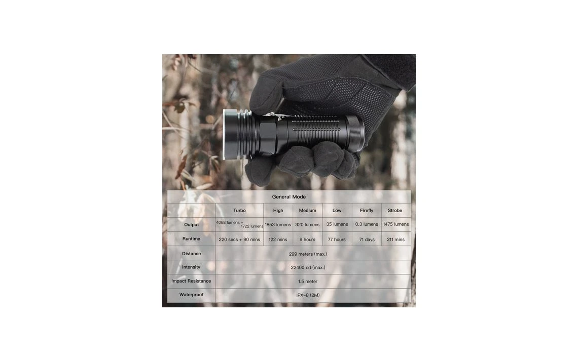 - Turbo: 4,068 – 1,722 Lumens – 220 Secs + 90 Mins