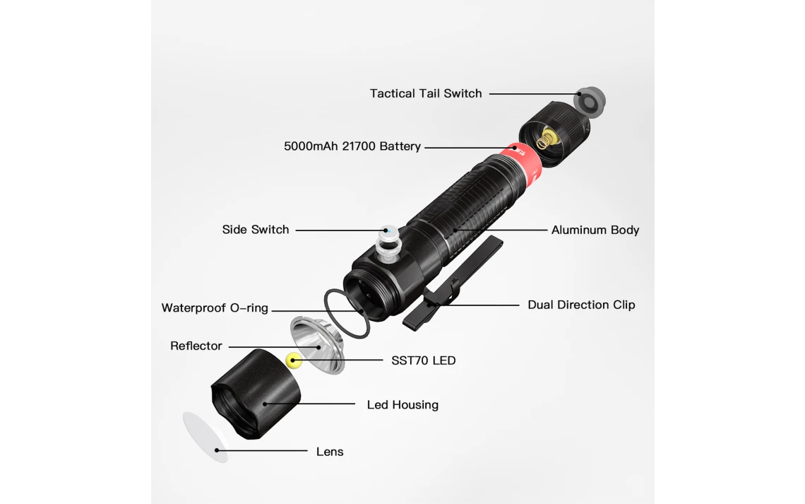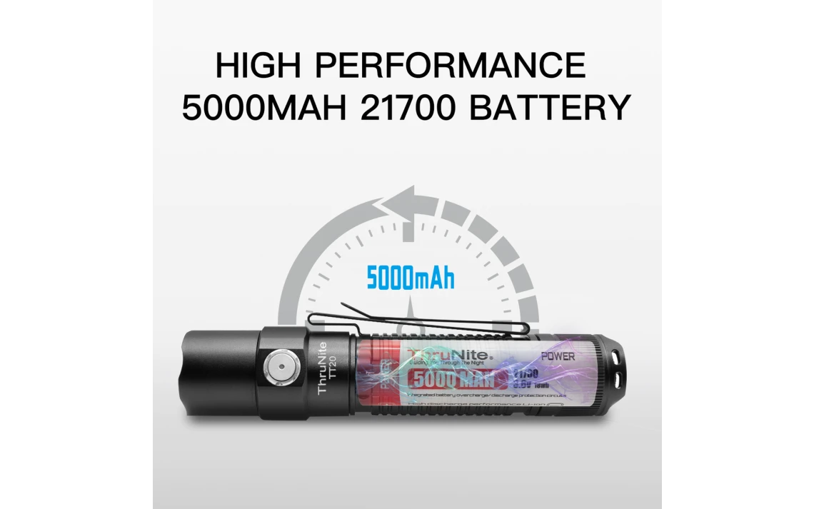 - Runs On: 1 x ThruNite customized 5000mAh 21700 battery (Included)