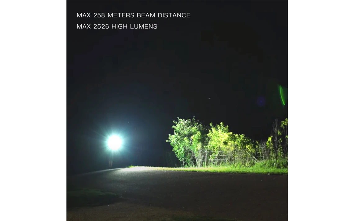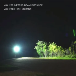 - Has a max output of 2,526 lumens and max beam distance of 258 metres