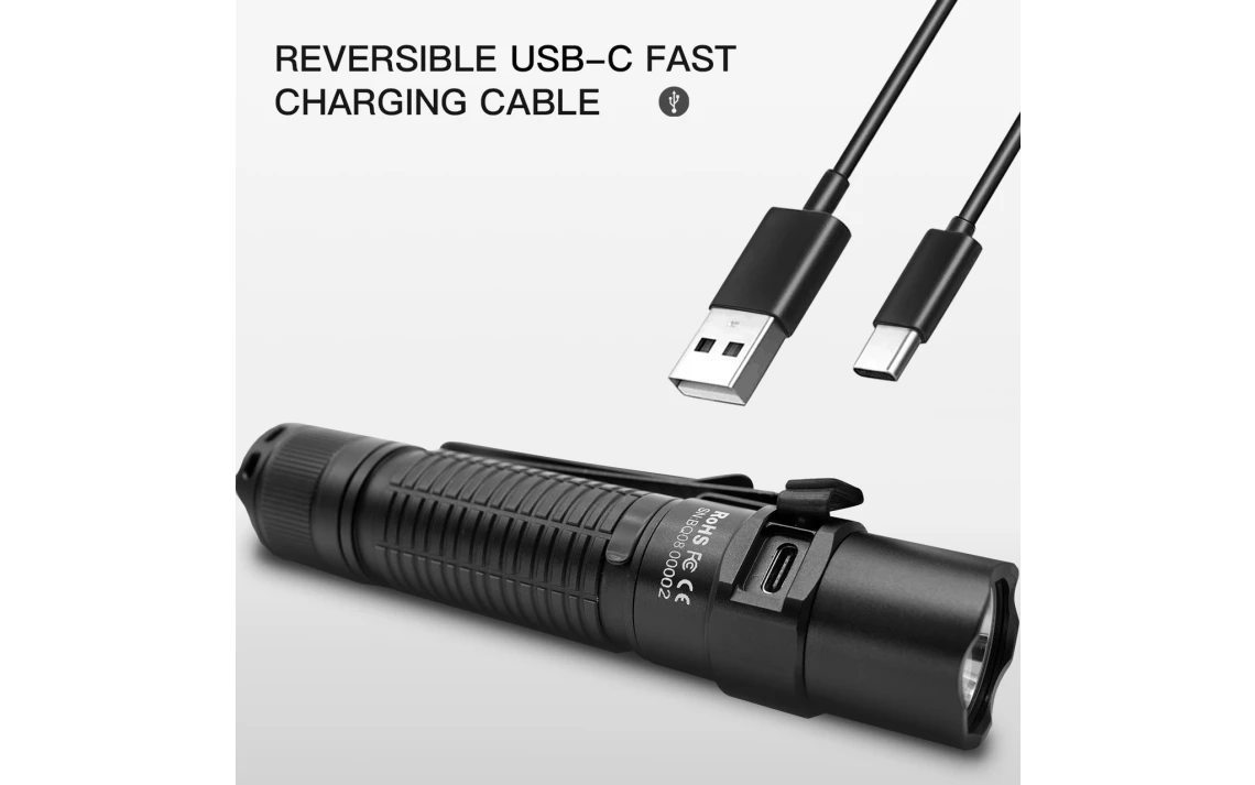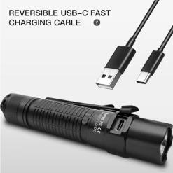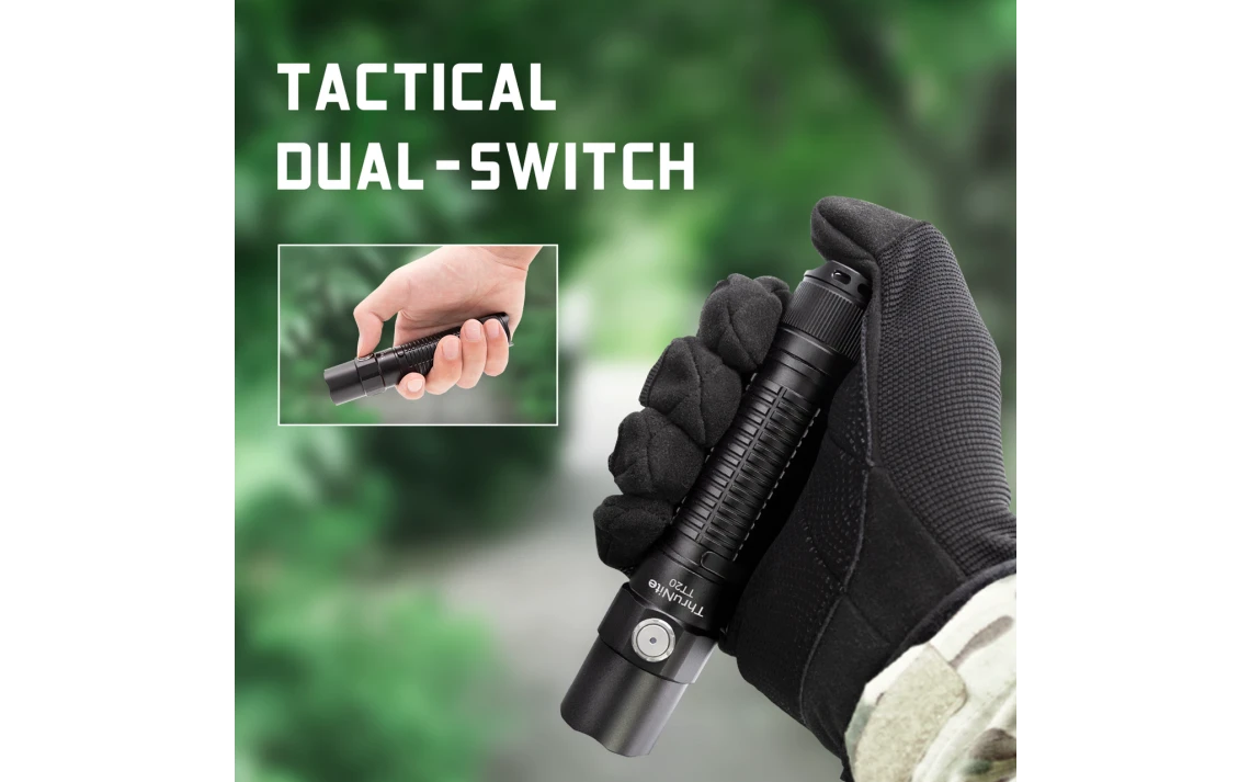 98g, 2,526 Lumens: The ThruNite TT20 Black is a tactical dual-switch torch that is great for security, hunting or outdoor use. The TT20 has a max output of 2,526 lumens and 258m beam distance. The side switch allows you to activate stepless dimming to get the exact level of brightness you need while the tactical tail switch gives you instant access to turbo mode with one click. The TT20 runs on one high capacity 5000mAh 21700 Li-Ion battery (included) to give you more power and longer runtimes compared to a normal 18650 battery. The TT20 is rechargeable via the built-in Type-C charging port with the included USB-C cable. Other features of this torch includes the battery level indicator, lockout mode to prevent accidental activation and a dual direction clip. ThruNite customised 5000mAh 21700 battery included.