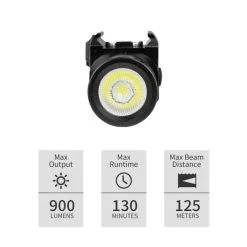- Output: 900 lumens ~ 427 lumens – 195 secs at 900 lumens / 130 mins at 427 lumens
