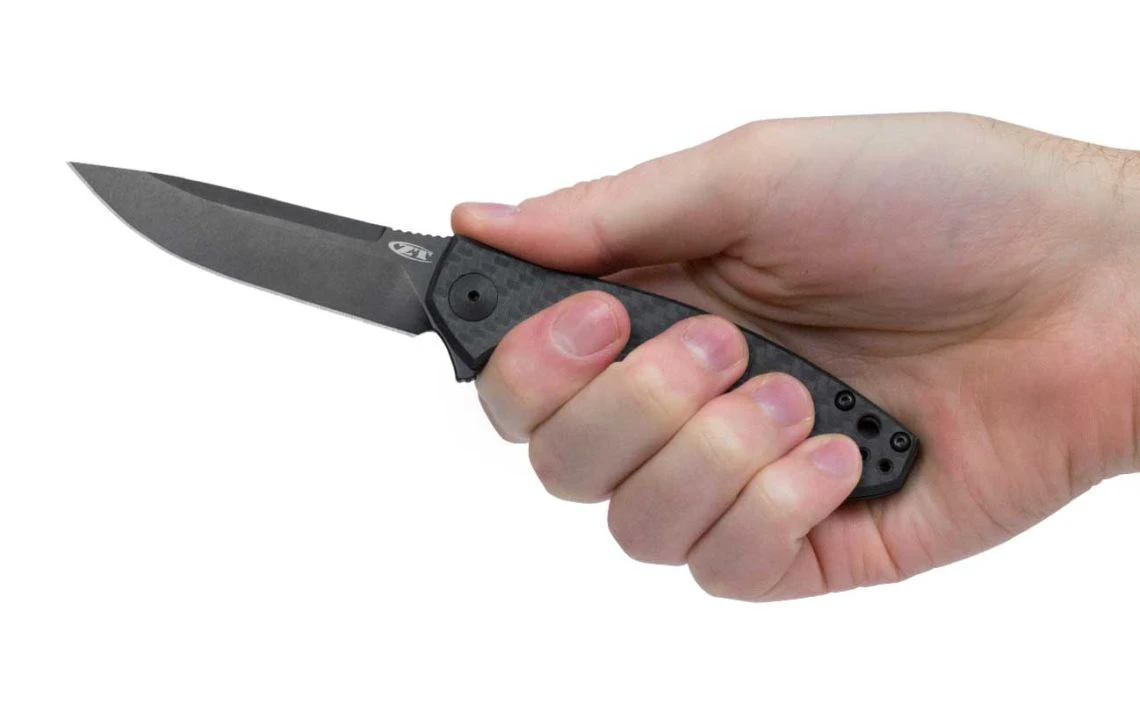 This sophisticated ZT is a smaller option that offers a robust combination of premium-quality materials. The front handle is carbon fiber, balancing the knife’s solid construction with lightweight convenience. The DLC-coated titanium back handle offers a secure frame lock—so you can always cut with confidence. As an extra visual touch, ZT added two eye-catching emerald-green tube spacers that stand out attractively against the dark handle.